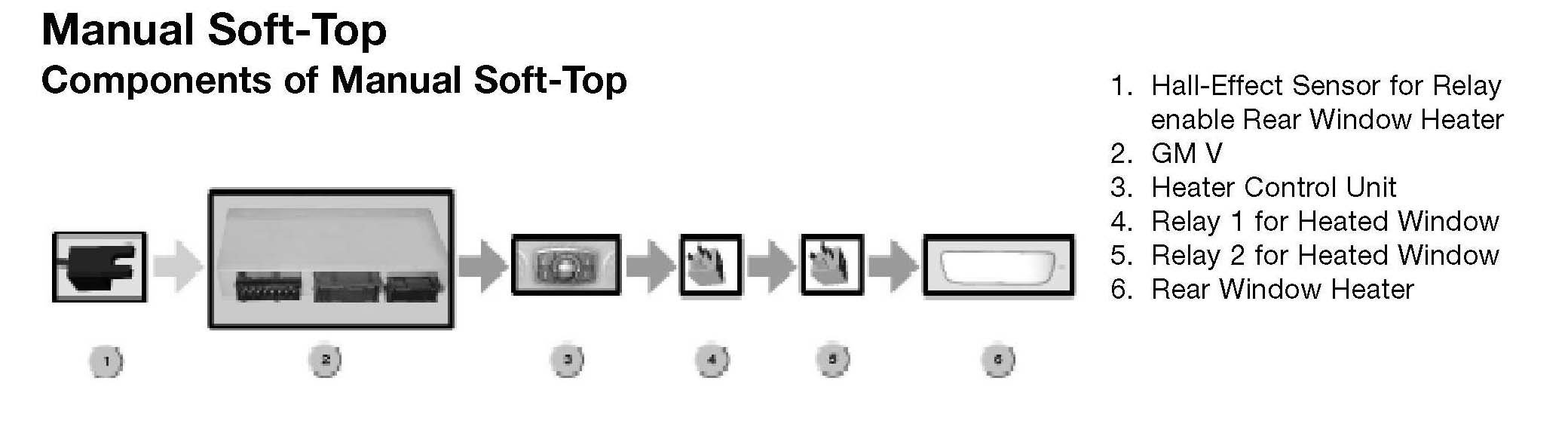 ^ Hall-effect sensor for detecting when soft-top is raised and locked to the windscreen top rail (enable signal for relay 2)