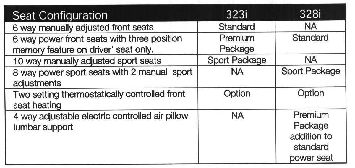 The E46 is equipped with a number of power/memory seat configurations. Depending on the model, the seat configurations are either standard or optional equipment.
