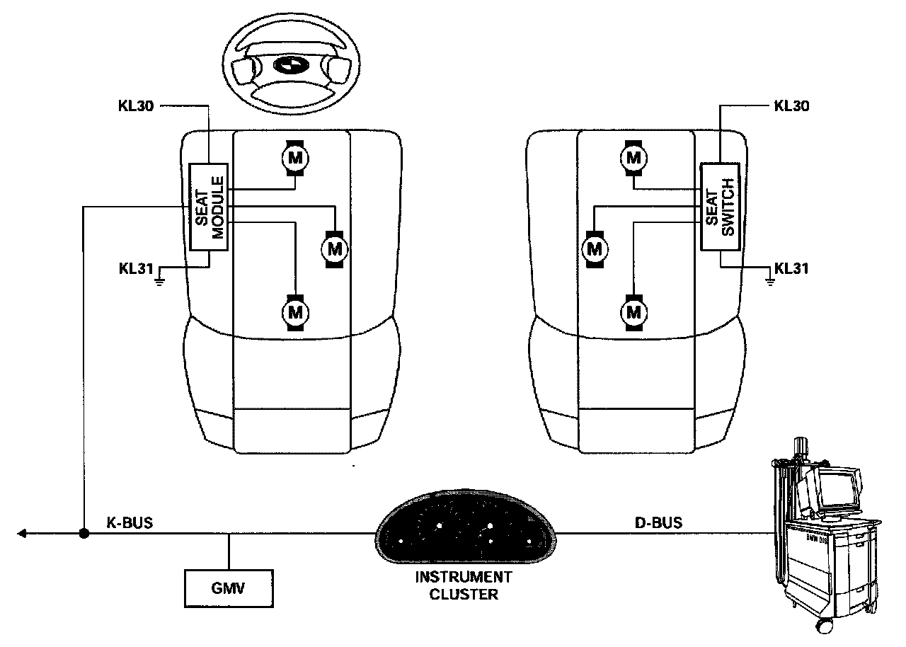 The SM communicates with the DIS or MoDiC via the K bus - instrument cluster gateway to the D bus. The SM monitors the seat motors and circuits as well as it's internal operation. Any detected faults are stored in the SM fault memory and are called up when diagnosing the system with the Fault Symptom diagnostic plan.
