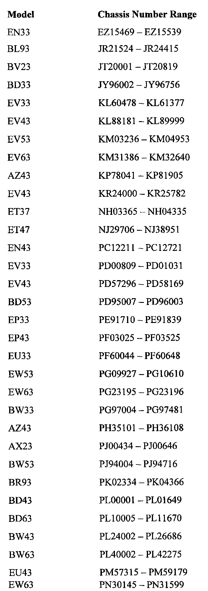 The Chassis Number Ranges listed are only for informational purposes and are not to be considered as the only deciding factor.