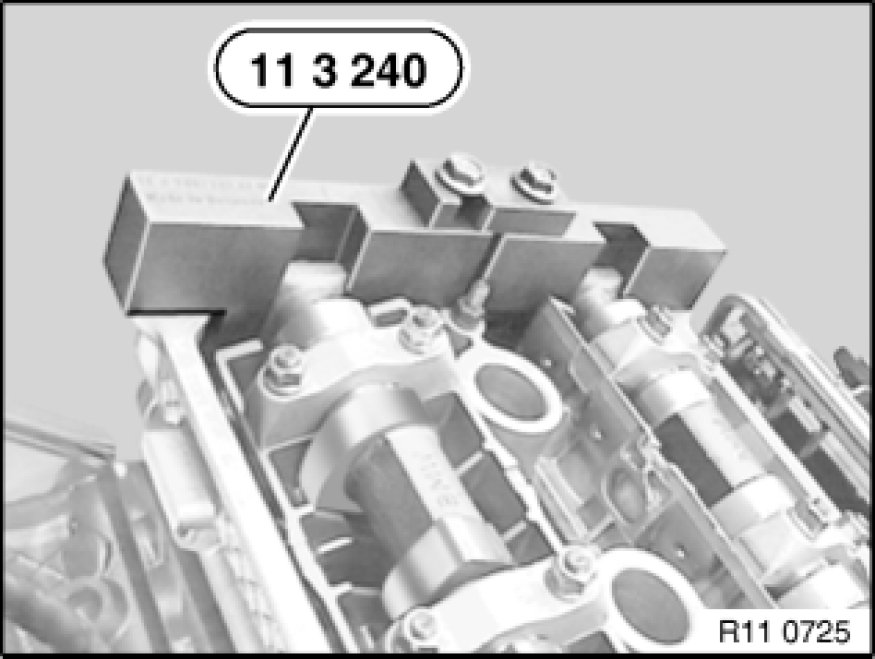 The timing is correctly set if the special tool 11 3 240 11 3 240 Locking Fixture rests without a gap on the cylinder head or protrudes up to 1 mm to the inlet side.