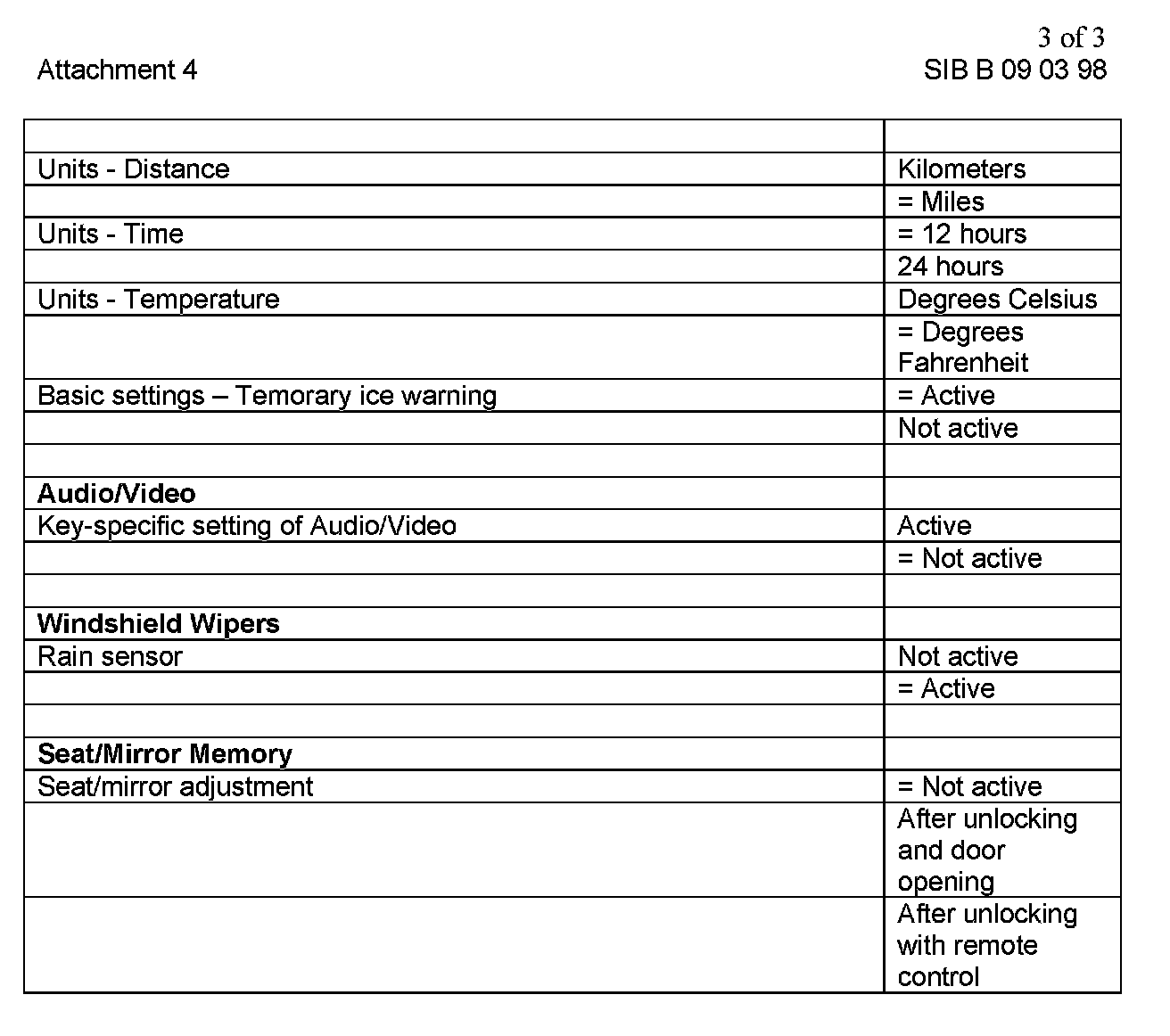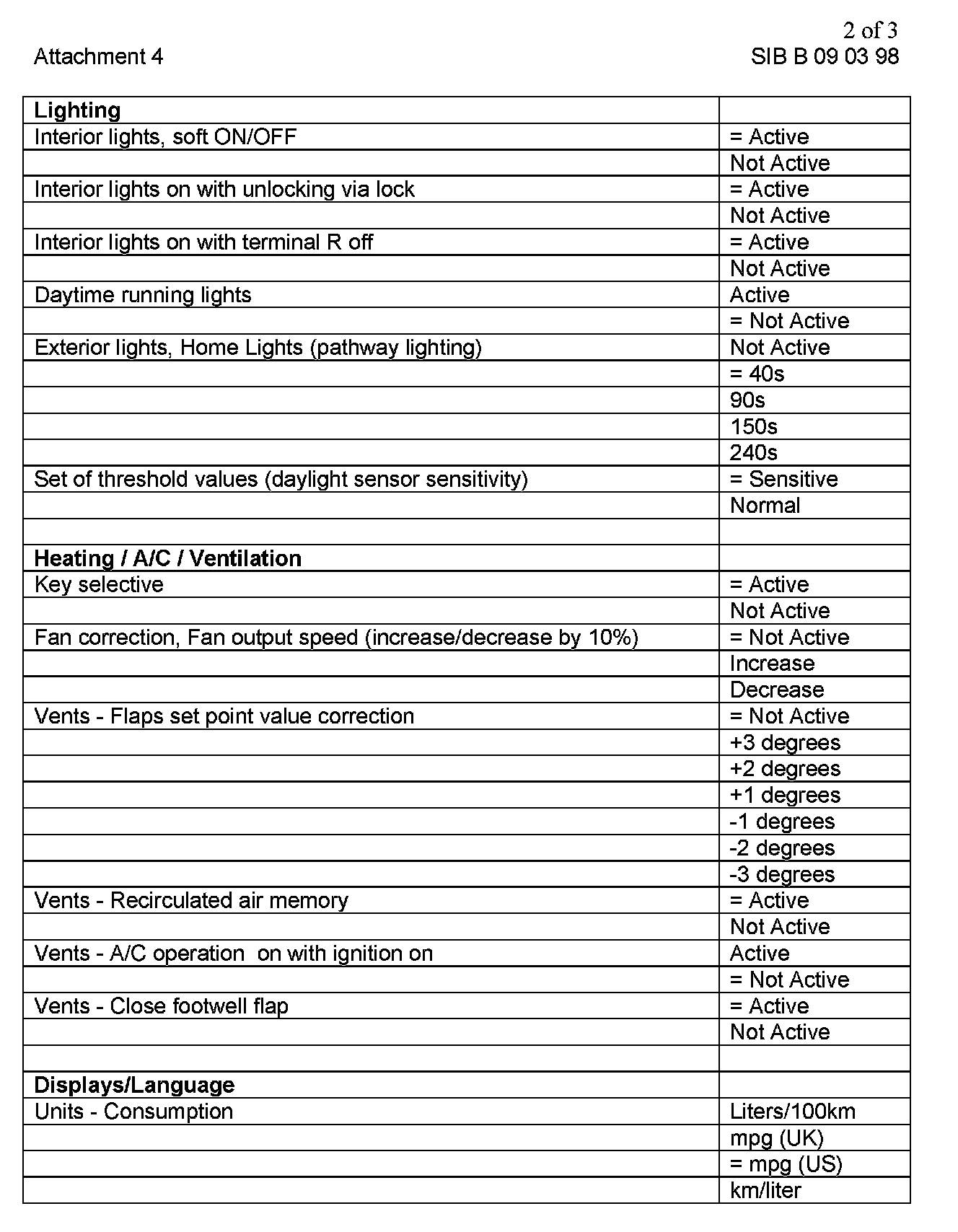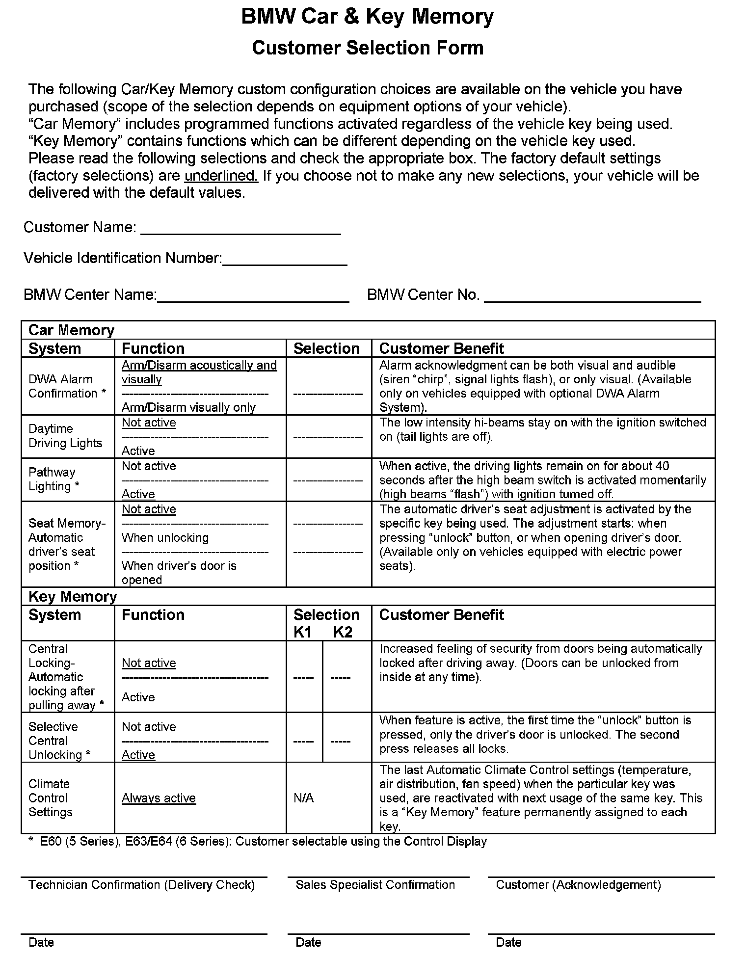 The customer must be informed about possible choices before delivery by filling out a selection sheet (included). The questionnaire is a three-part form: one copy stays with the customer, one goes to sales department, and the last to service department. According to the customer choices, the vehicle should be customized during the QC 1. Selection changes during the ownership period are not reimbursable under warranty. The customer should not be charged for the coding. Individualizing your