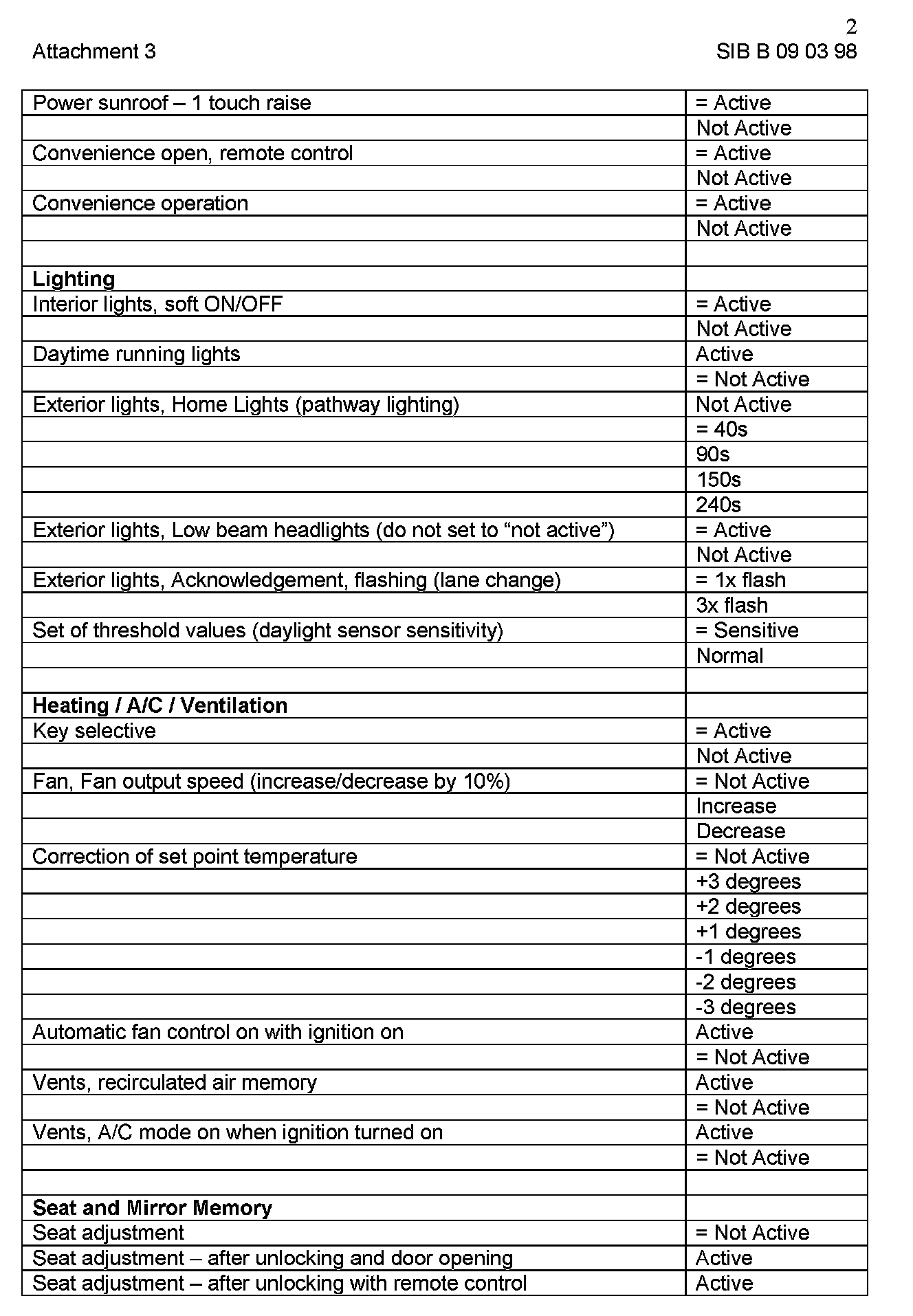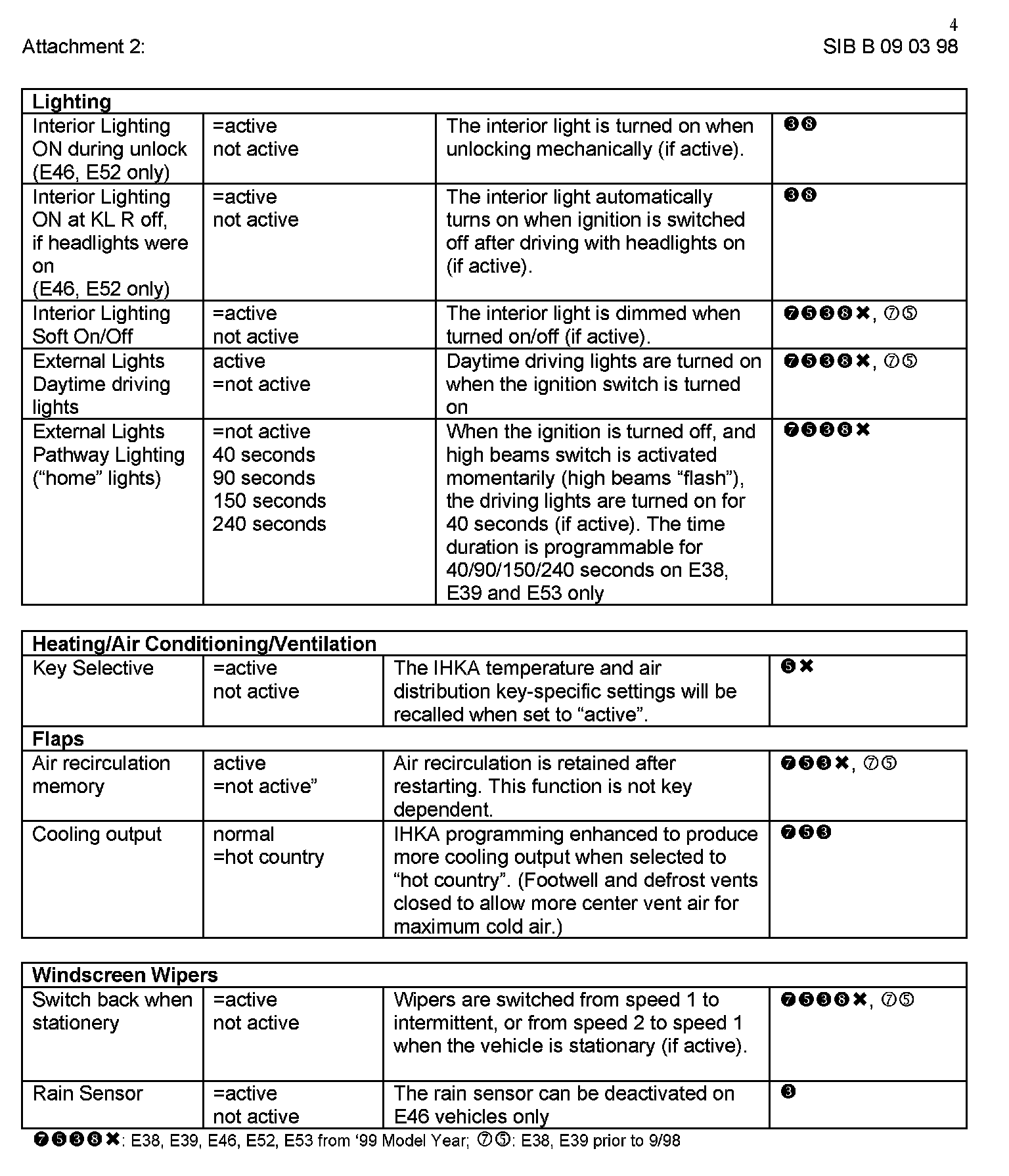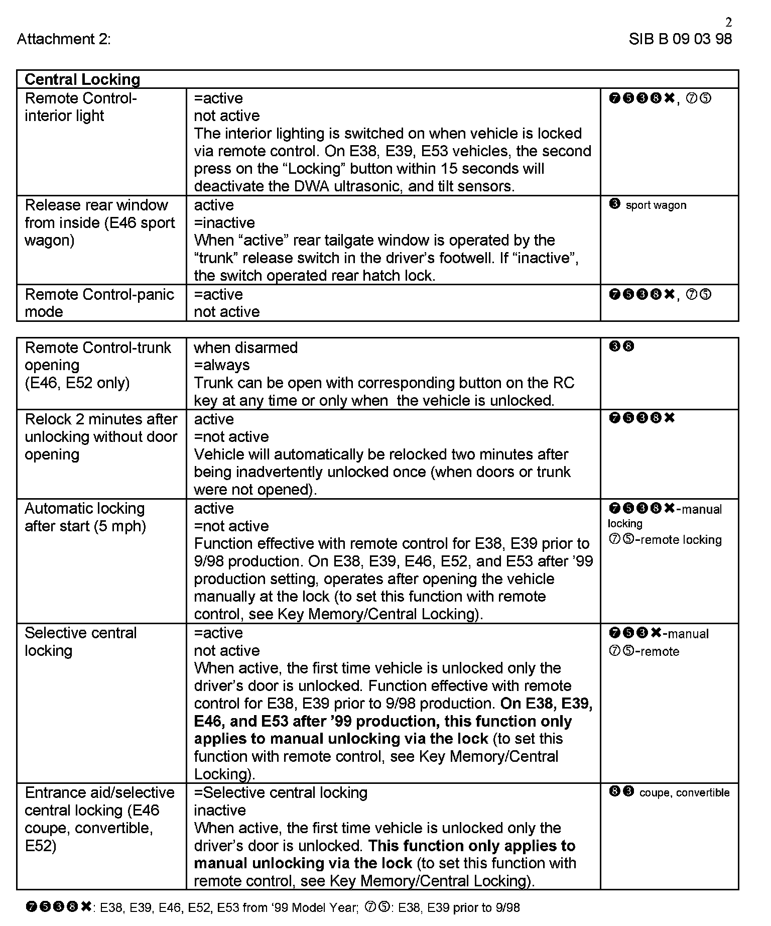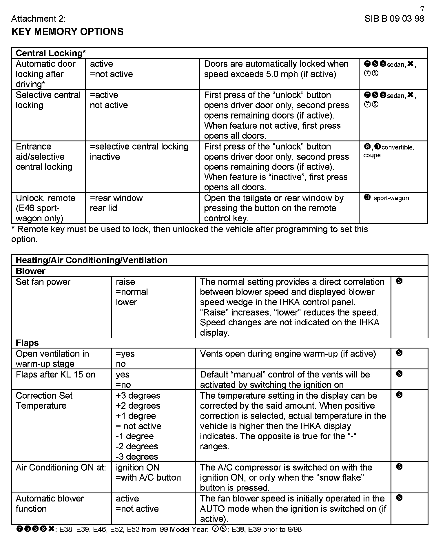 Attachment "B090398_Att2_CKMSet" itemizes all available "Car and Key Memory" options for the E38, E39, E46, E53, and E52 vehicles.