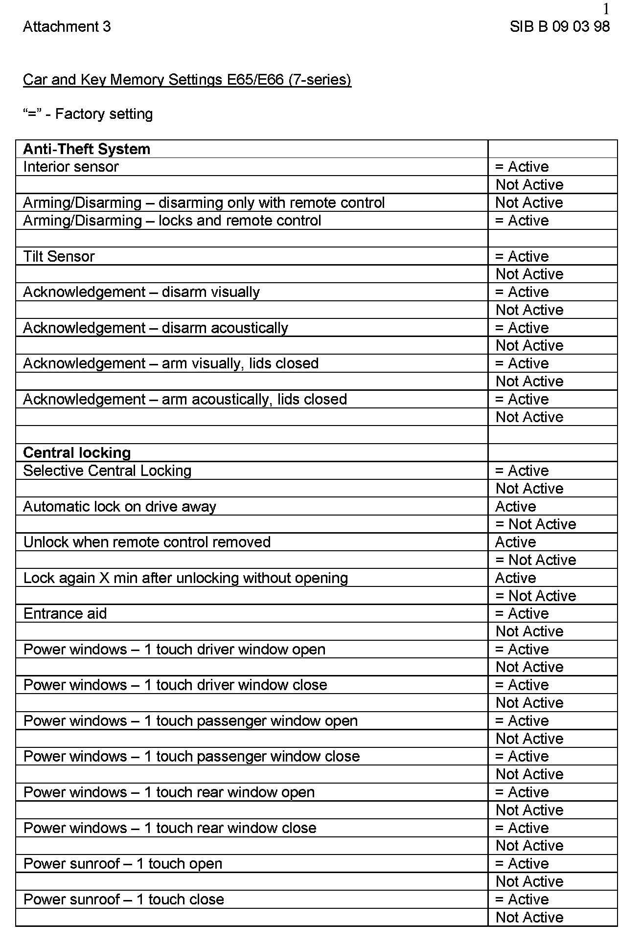 Attachment "B090398_Att3_CKM_E65" itemizes all available "Car and Key Memory" options for the E65 and E66 vehicles.