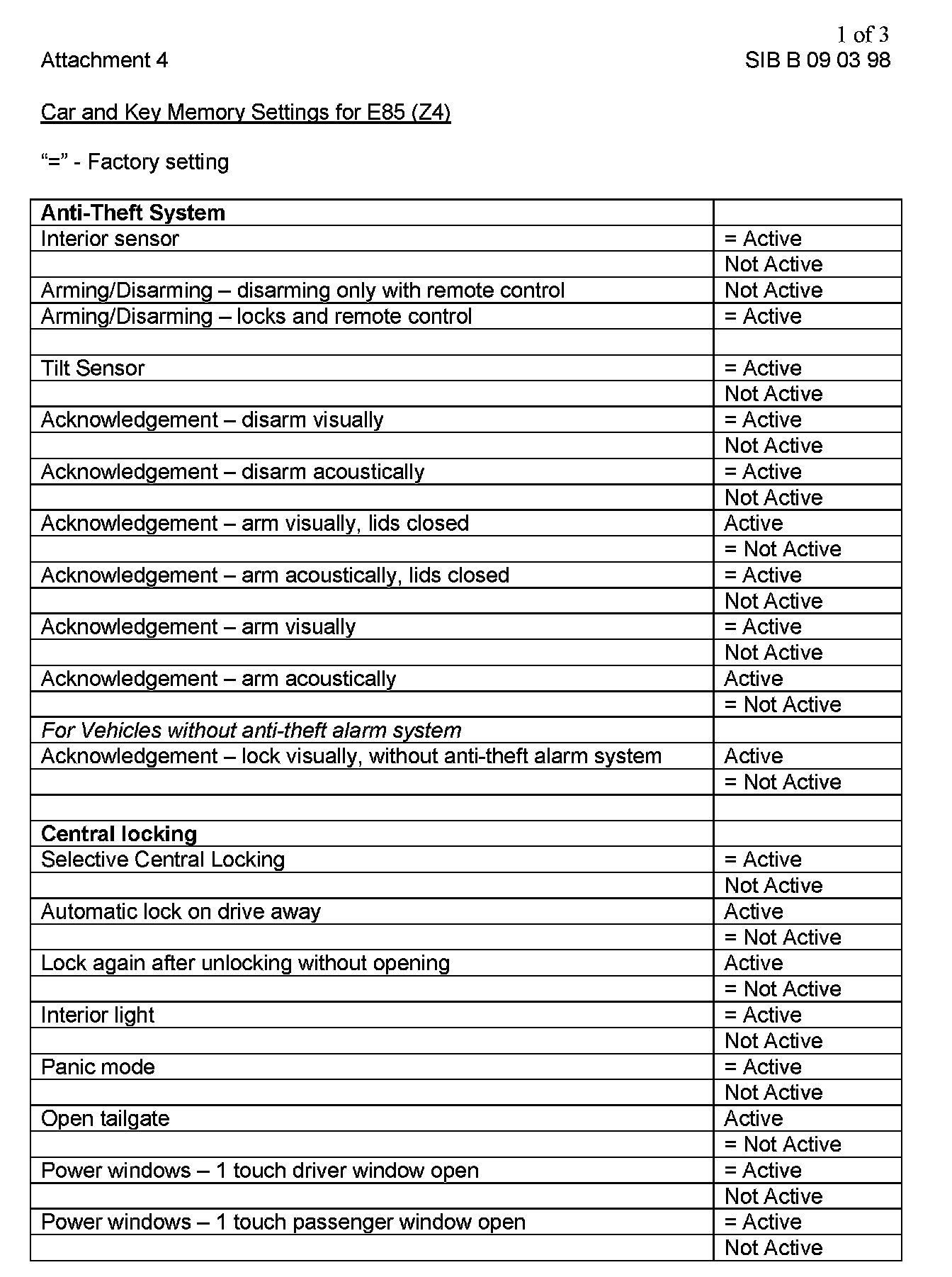 Attachment "B090398_Att4_CKM_E85" itemizes all available "Car and Key Memory" options for the E85 vehicles.