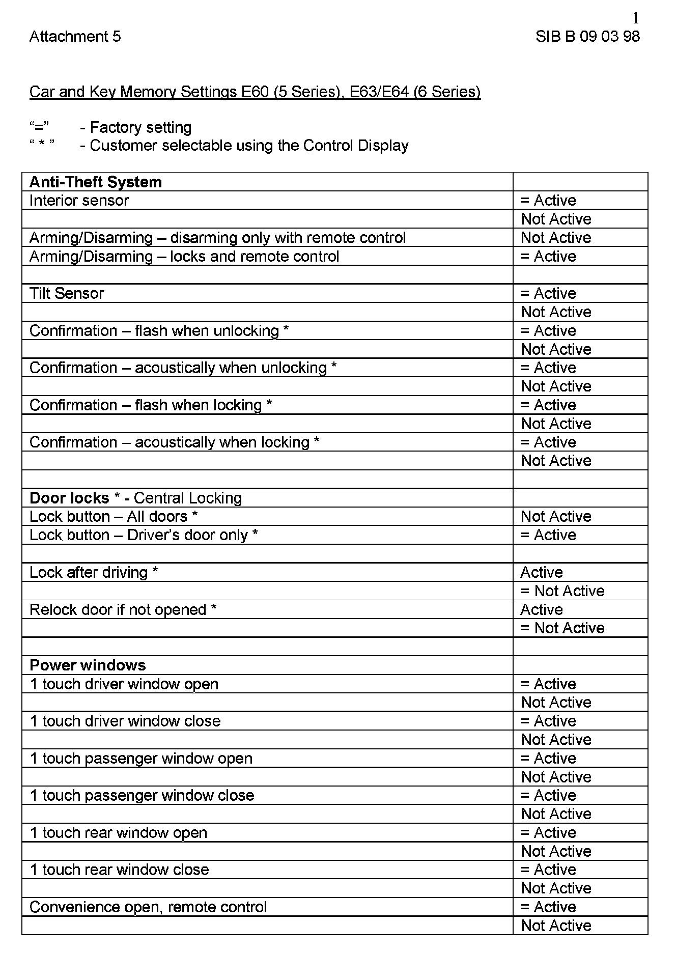 Attachment "B090398_Att5_CKM_E60" itemizes all available "Car and Key Memory" options for the E60, E63 and E64 vehicles.