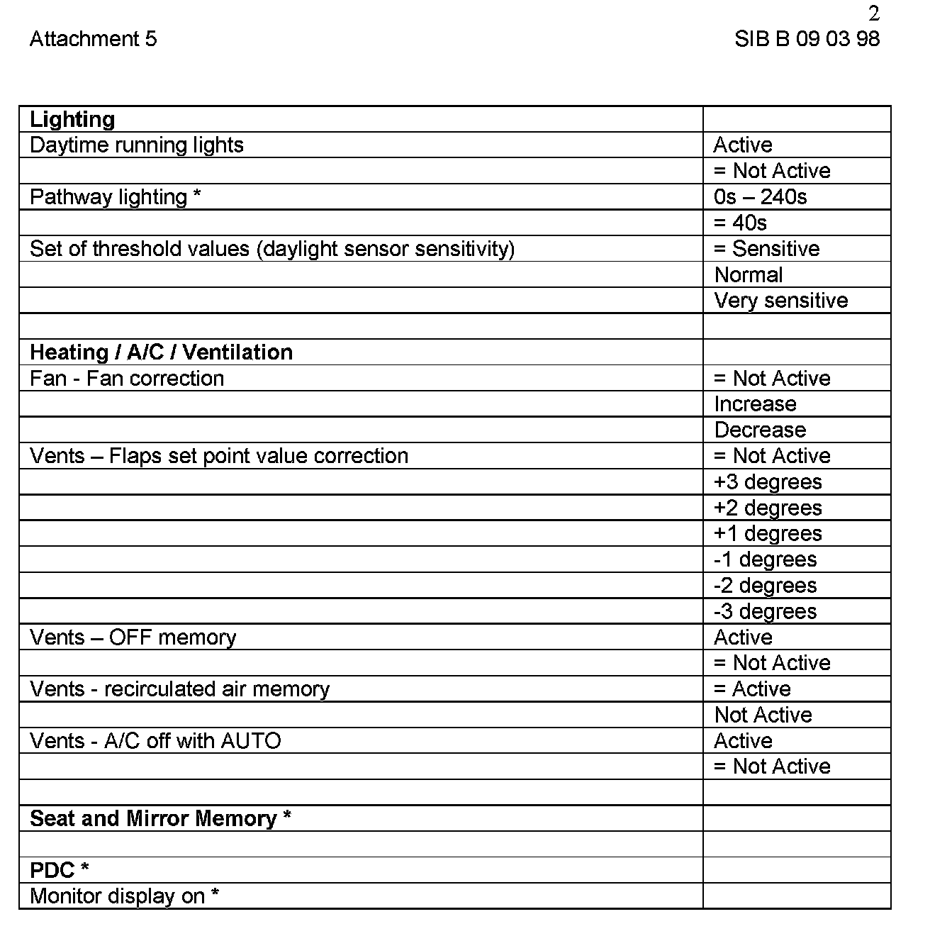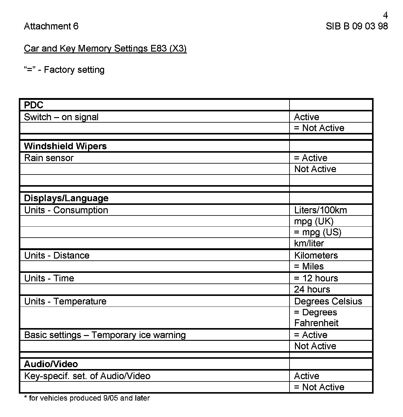 "*" - sign indicates factory default (when present vehicle selection is different)
