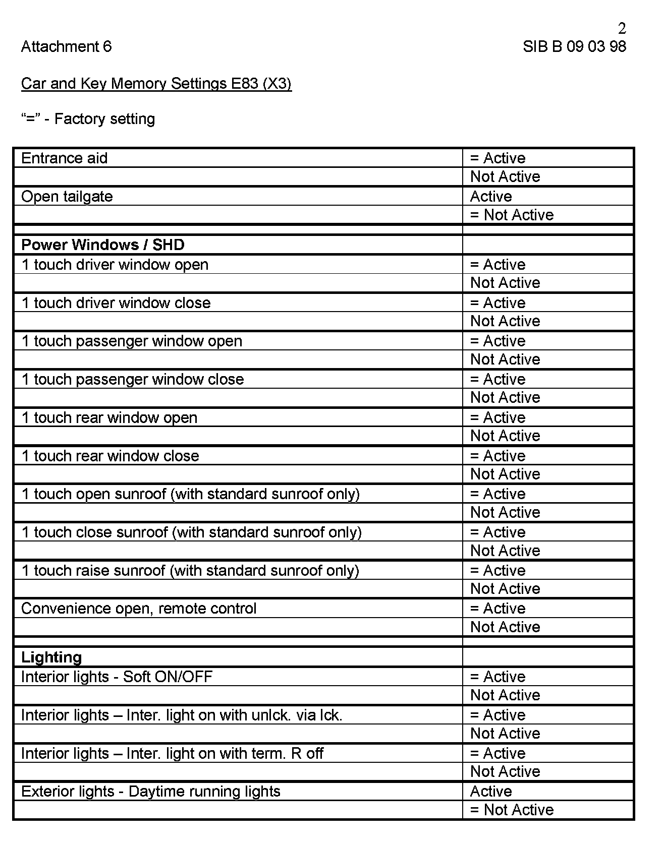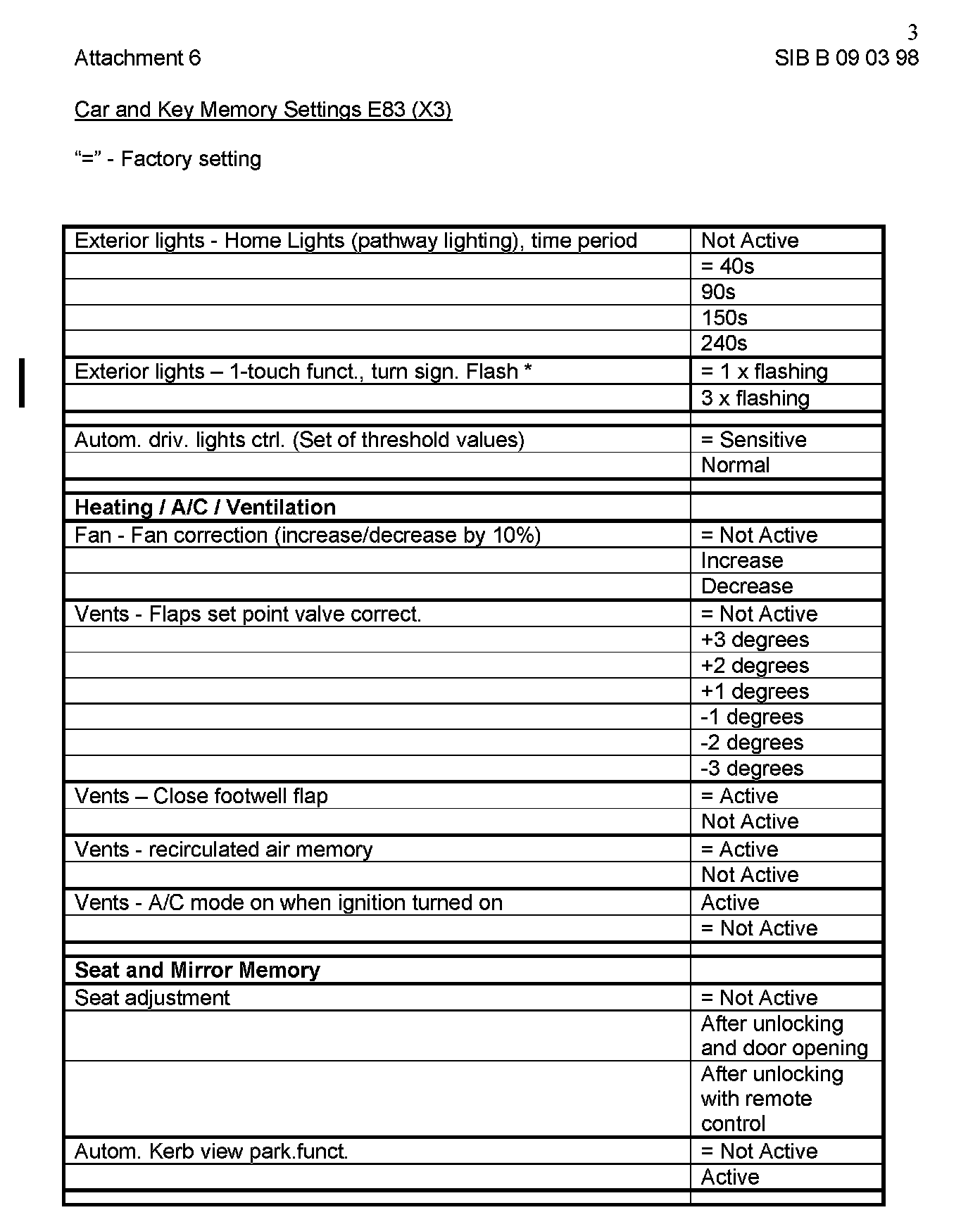 Attachment "B090398_Att6_CKM_E83" itemizes all available "Car and Key Memory" options for the E83 vehicles.