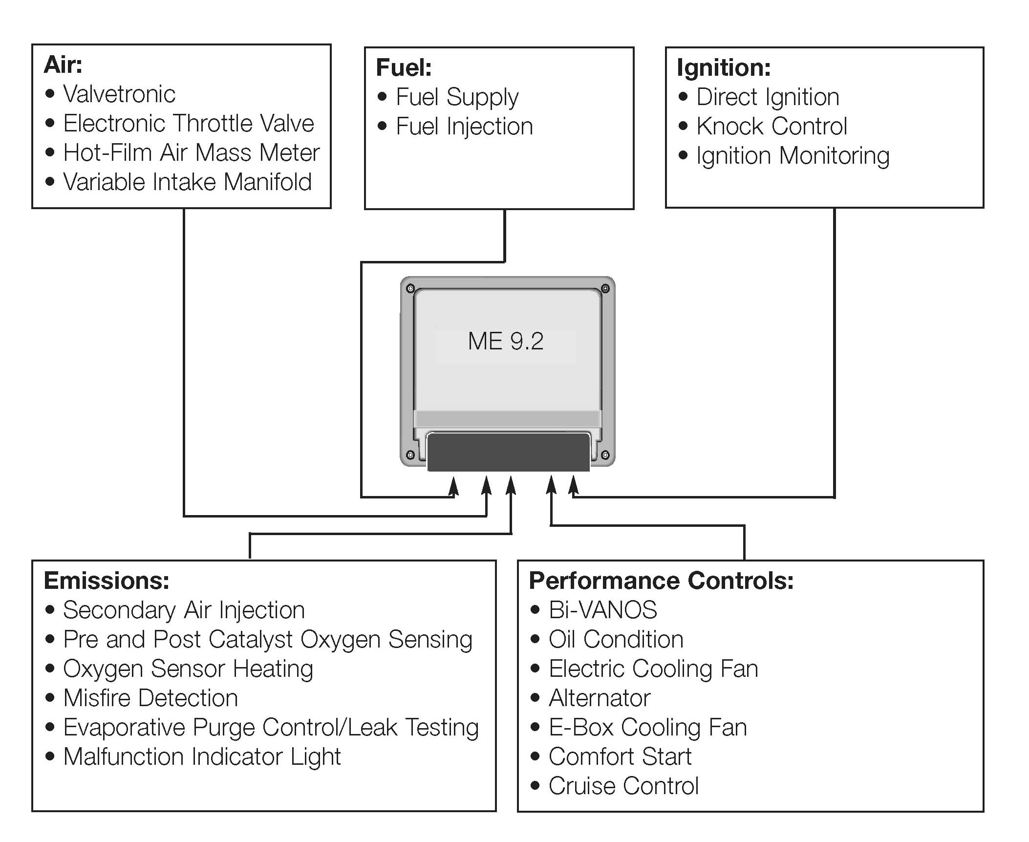 The ME 9.2 system (in the N62 equipped E60 - 545i) manages the following functions: See Fig. 1