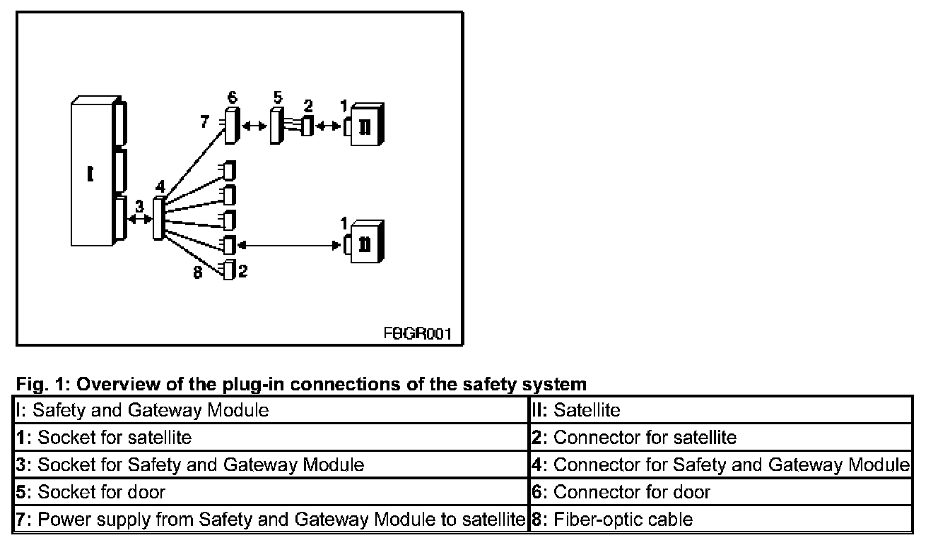 Fig. 1 shows the various plug-in connections of the safety system. The Safety and Gateway Module has a six-pin socket for plugging the six-pin fiber-optic cable connector. The connection between the Safety and Gateway Module and the satellites is by means of fiber-optic cable. In the case of the door satellites (or door modules), there is an additional isolation point between the door and frame of the vehicle. The satellites are supplied by the Safety and Gateway Module with a voltage between 9 V and 11 V. However, the connector for the power supply is not shown in Fig. 1.