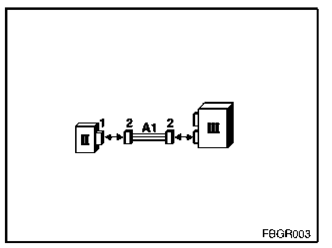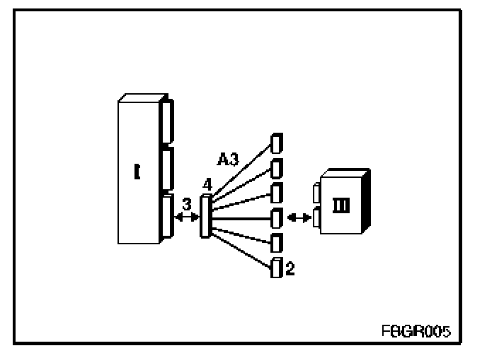 3. To test the satellite (II), the satellite adapter (A1 = 663131) is required. The satellite adapter (A1) has, alongside the fiber-optic cable, two more electrical wires. The two wires are needed for the power supply of the satellite. The voltage is generated by the optical testing and programming unit (III).