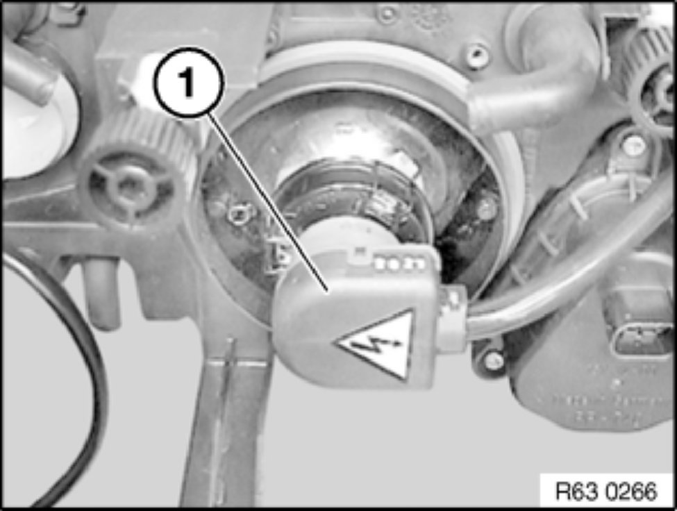 Pull out ignition unit of xenon lamp (1) through opening in protective cap.