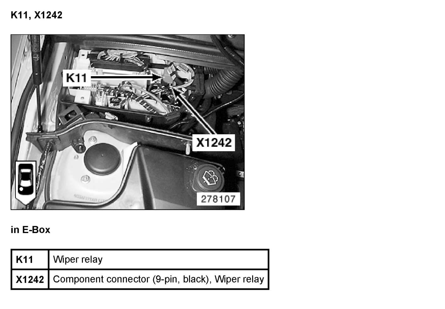 The E-box is located in the right rear of the engine compartment, under a plastic cover.