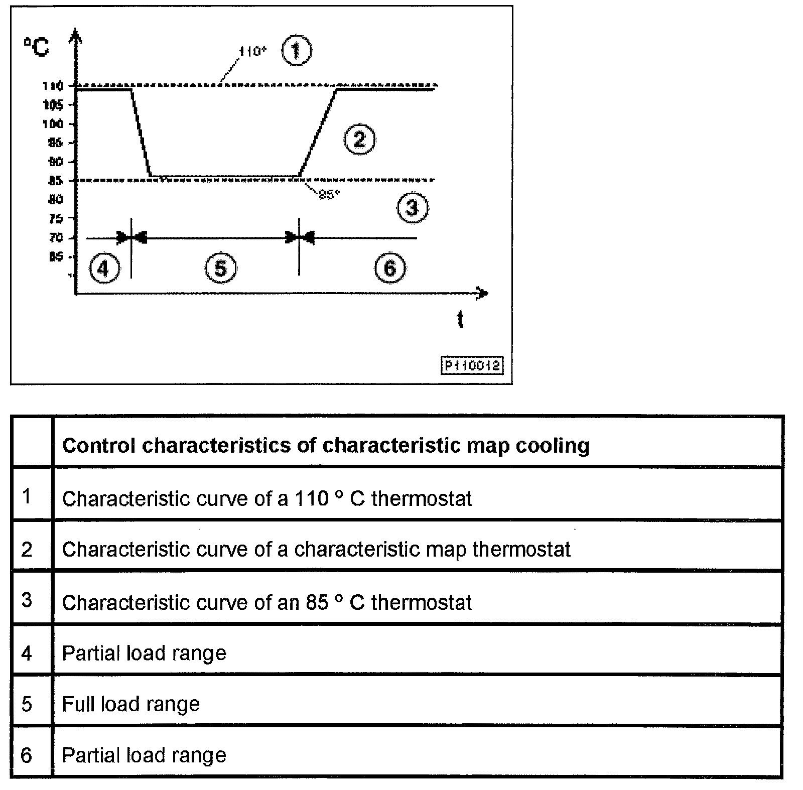 The characteristic map thermostat is designed such that it opens (engine inlet) at a coolant temperature at the thermostat of 103 degree C without intervention of the integrated heating system. Due to the coolant heating up in the engine, a temperature of approx. 110 degree C is measured at the point the coolant flows out of the engine (installation location of coolant temperature sensor for DME and instrument cluster gauge). This is the operating temperature of the engine, at which the characteristic map thermostat begins to open without control intervention.