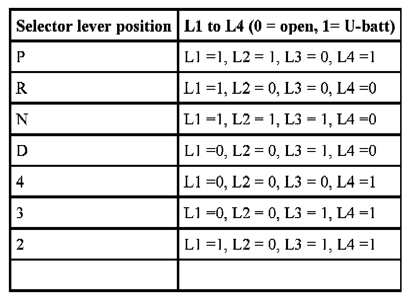 Selector Lever SwitchThe AGS control unit detects the selector lever position by way of a switch on the transmission. This switch converts the current selector lever position into a code. This selector lever code is transferred via four lines (L1-L4) to the AGS control unit.