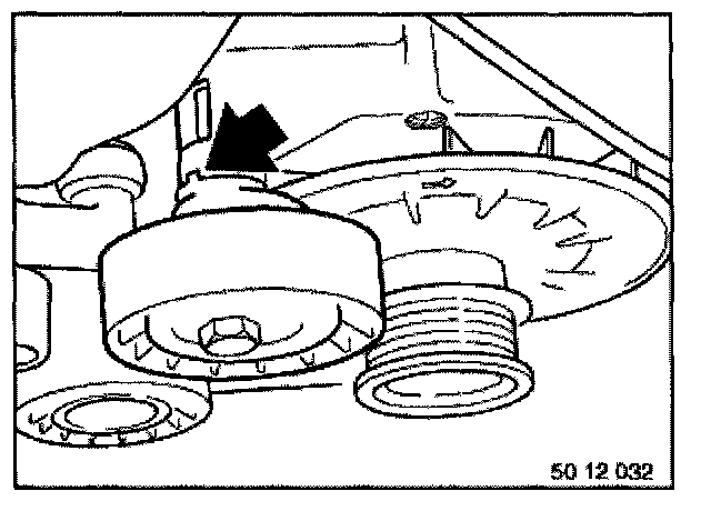 Installation Note: Turning lock of tensioning roller must engage in alternator groove.
