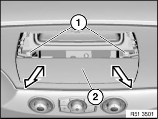 Release screws (1) and remove radio cutout trim (2) in direction of arrow.