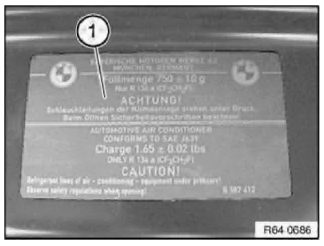 Information on the required refrigerant fill quantity for the entire A/C system is contained on the rating plate (1) in the engine compartment.