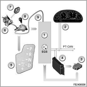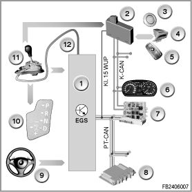 The M/S position is notified to the transmission control by the Steptronic switch directly via line (signal name: EGS_MGE or EGS_MGA). The Steptronic switch is integrated in the gear selector switch. The selector-lever settings of the Steptronic for shifting the individual gears up and down are notified to the transmission control directly across a line (signal names: EGS_UP; EGS_Down).