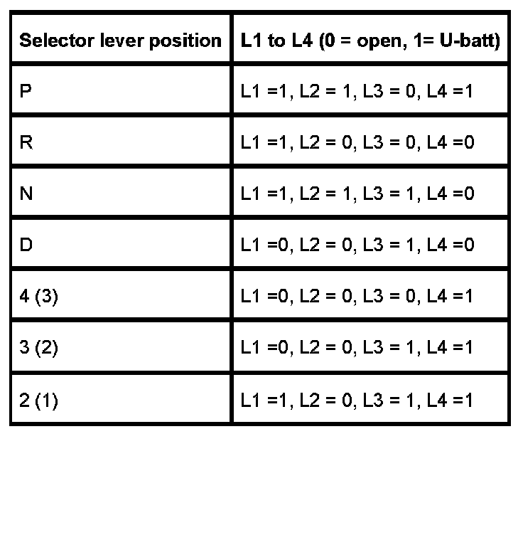 The EGS control unit detects the selector lever position by way of a switch on the transmission. This switch converts the current selector lever position into a code. This selector lever code is transferred via four lines (L1-L4) to the EGS control unit.