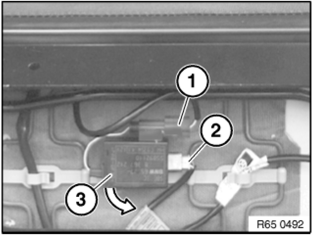 Unlock and disconnect plug connections (1) and (2), remove control electronics for passenger seat occupancy detector (3).