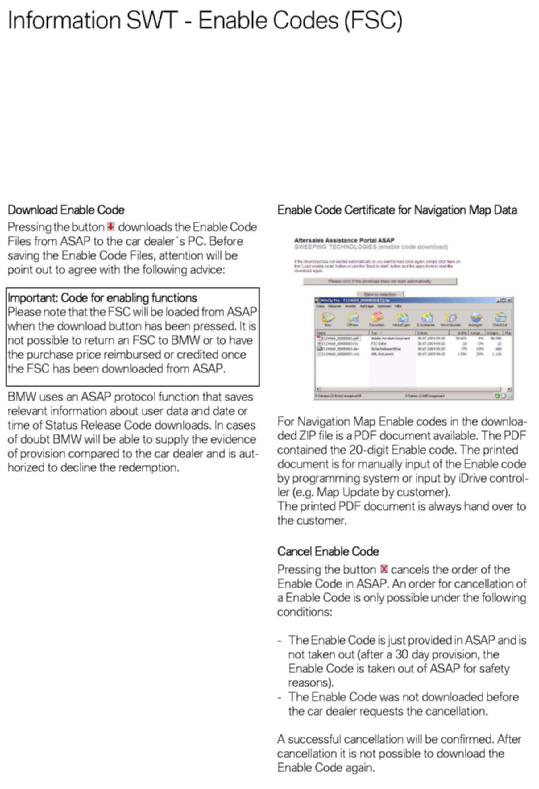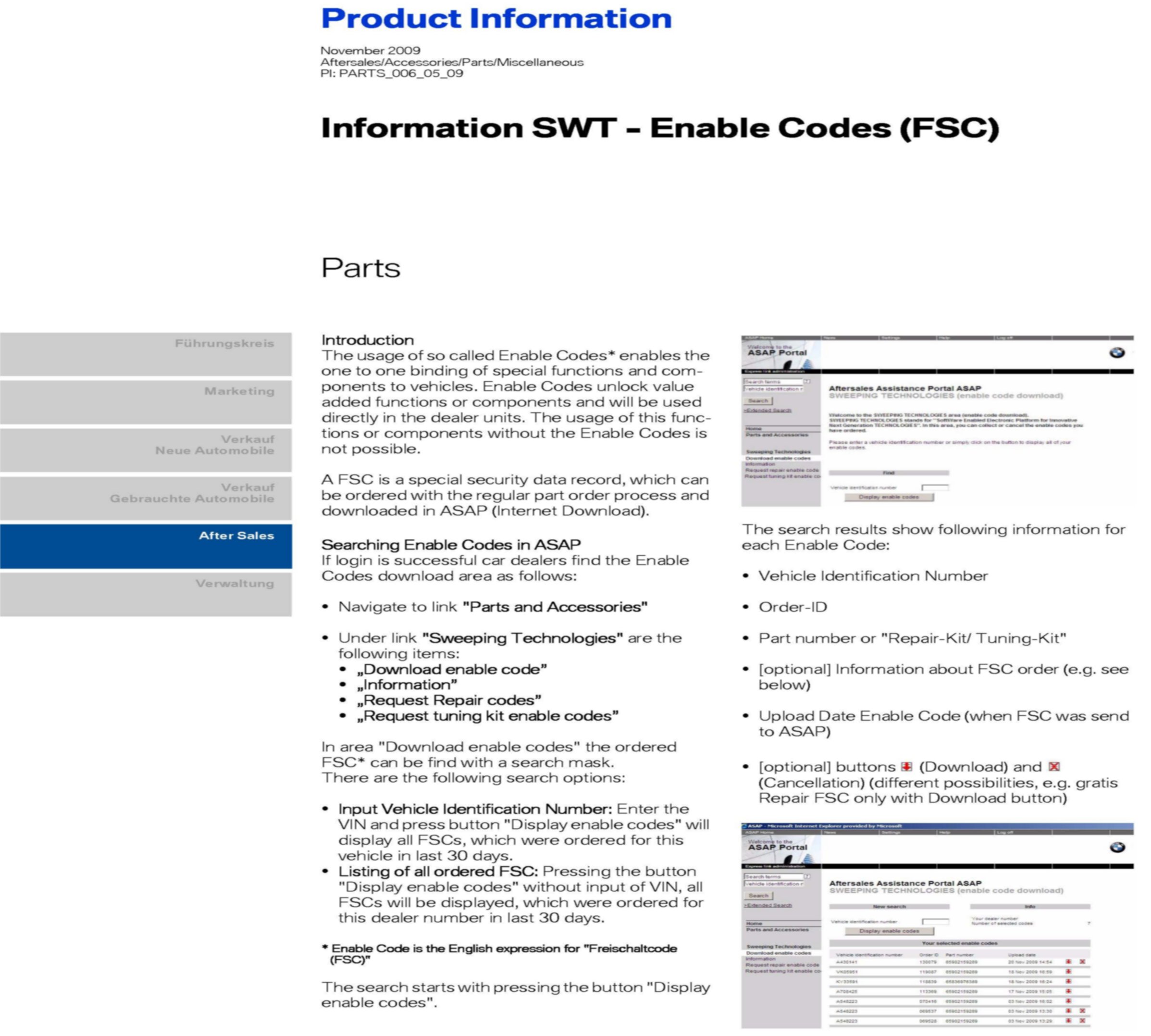 The abbreviation FSC stands for Freischaltcode, which is the German translation for Enabling Code. These codes are used to enable hardware or software in our vehicles to protect unauthorized access to various vehicle functions. These codes are ordered via the EPC and delivered through the Sweeping Technology system, SWT.