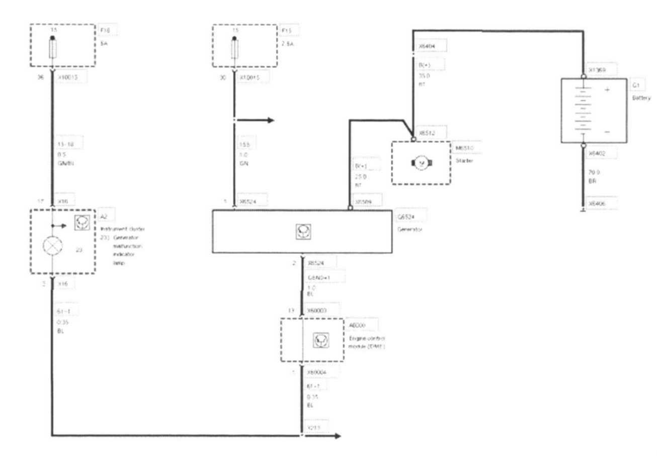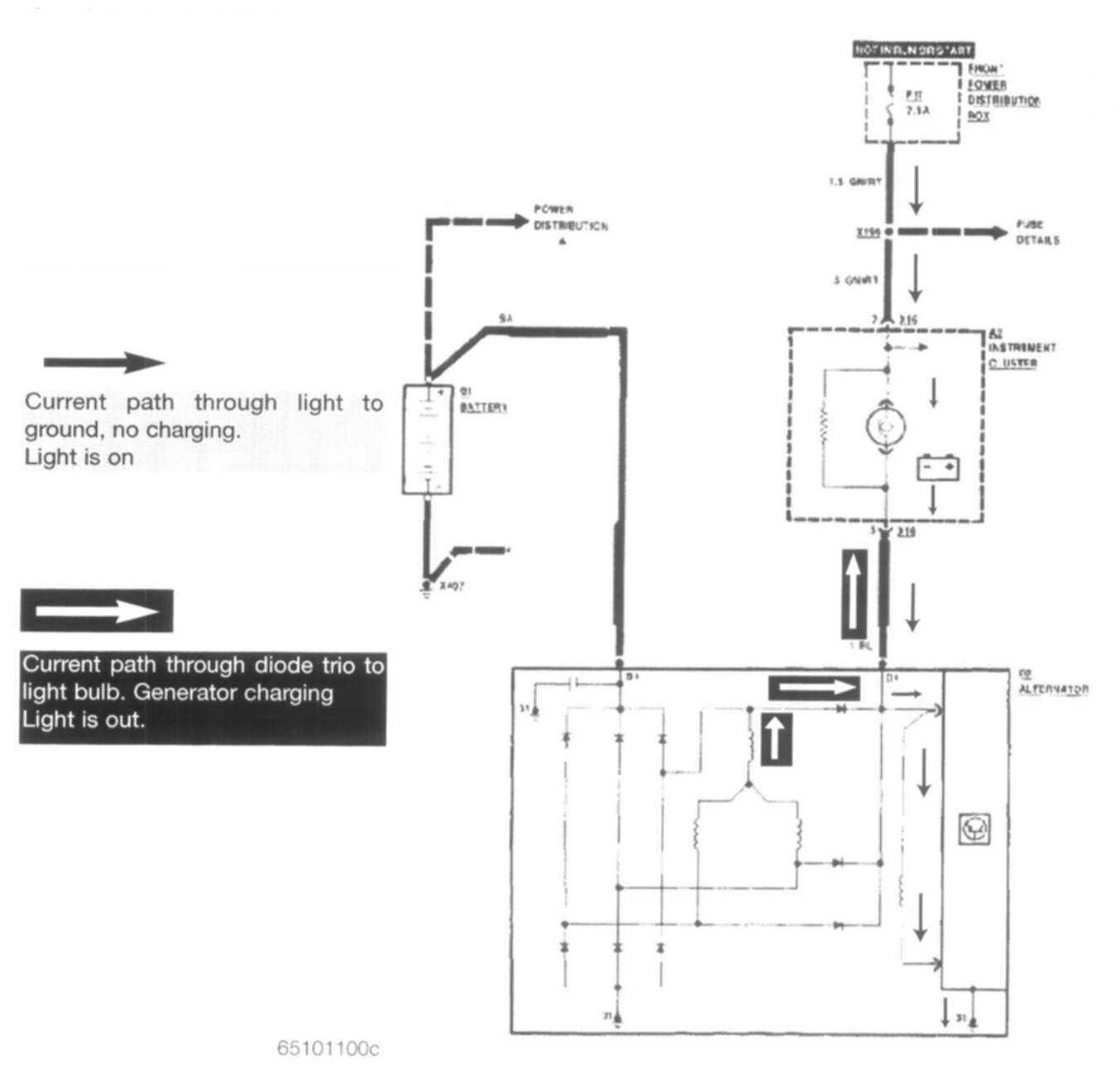 The indicator lamp is supplied with voltage via terminal 15 from the instrument cluster. The lamp is illuminated when the voltage at terminal 61 E is below 1.5v and goes out when the voltage is above 8v.