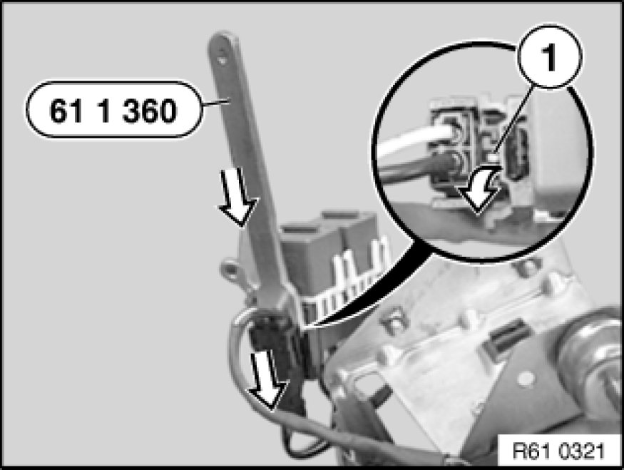 Unlock hook (1) with special tool 61 1 360 and slide plug housing downwards out of base.