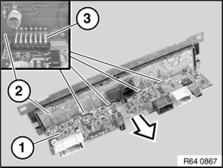Detach main circuit board (1) at outer edges in direction of arrow from circuit board (2).