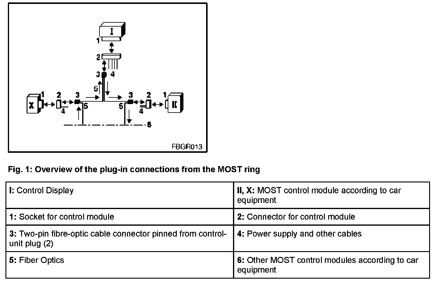 - Another MOST control module is defective in front of the fiber-optic cable in the MOST ring (where there is no flashing light at the exit)