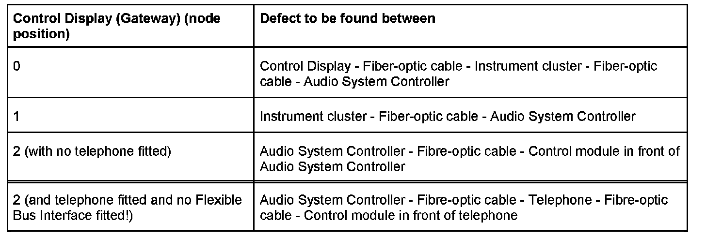 Example (control module Rear Display not fitted): The Audio System Controller control module has stored the relative node position 0. The instrument cluster therefore stores the relative node position 1 and the Control Display (Gateway), the relative node position 2. Node position 2 can be read out by the Control Display (Gateway). Thus, on the basis of the node position stored on the Control Display (Gateway) and the details of the MOST control modules fitted on the vehicle, it is possible to locate the position of the fault in the ring by simply counting backwards from the Control Display (Gateway):