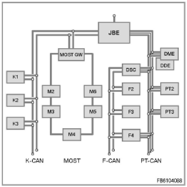 The following block diagram provides an overview of the control modules and bus systems deployed in the vehicle.