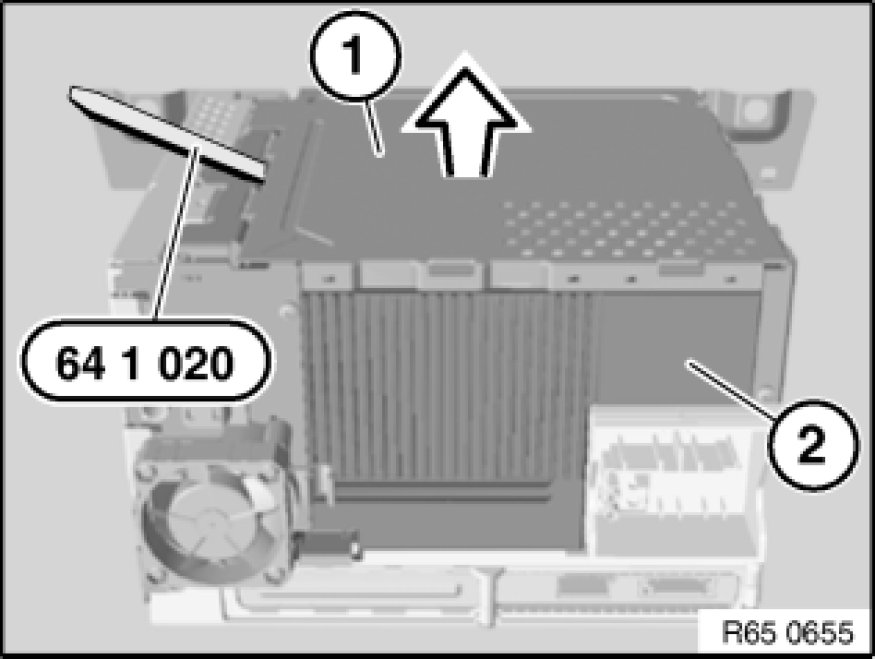 Raise cover (1) with special tool 64 1 020 all round and remove from Car Communication Computer (2).