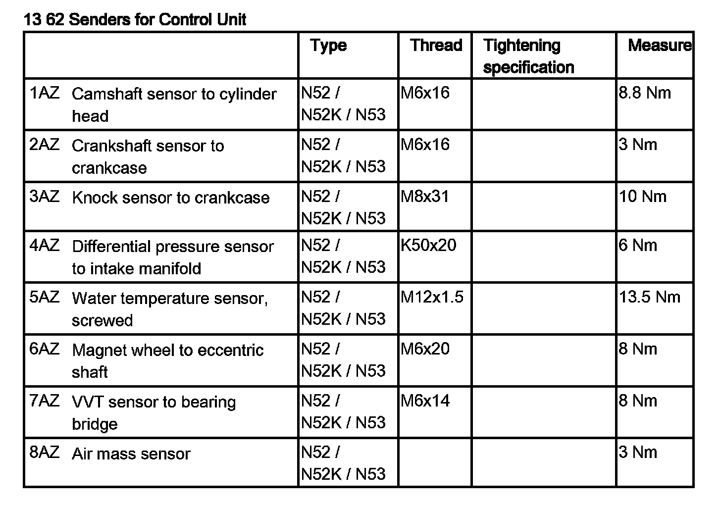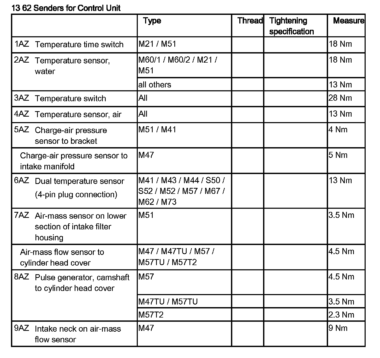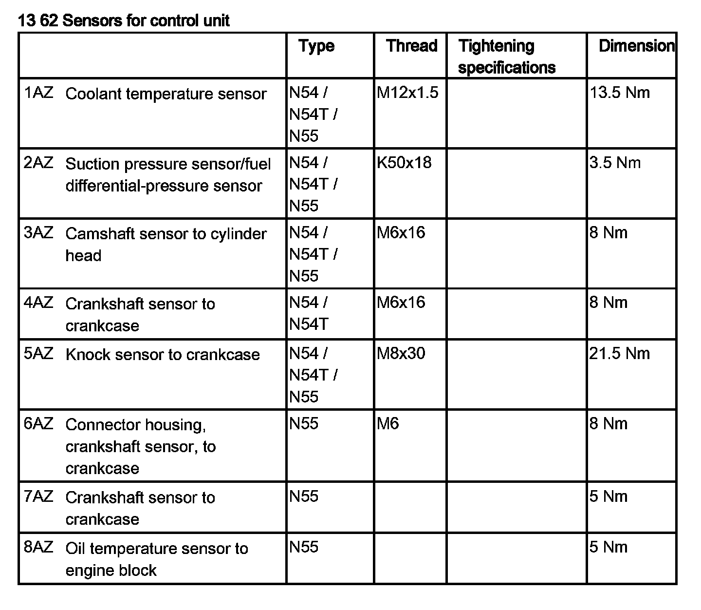Tightening torque 13 62 2AZ.