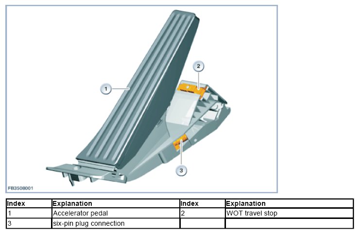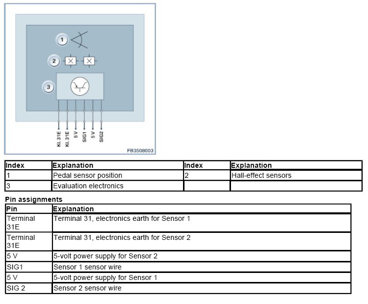 Accelerator pedal position is monitored separately by 2 individual sensors. Two sensors are employed to provide redundancy, implement the monitoring function and facilitate recognition of malfunctions.