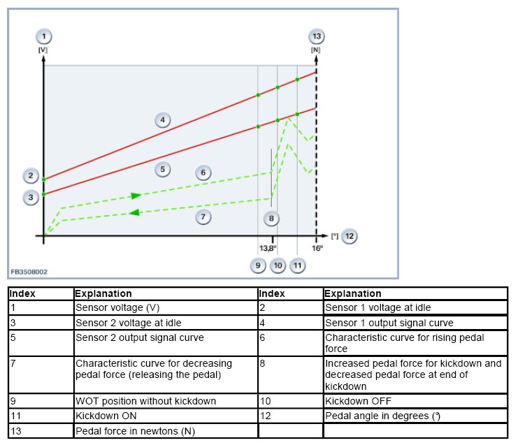 Start of kickdown phase: The detent position at which increased pedal force is required lies between a maximum of 13.8° and a minimum of 1.6° before the mechanical travel stop. On the characteristic curve, the threshold value for kickdown ON must be immediately after the point for maximum pedal force for initiating kickdown.