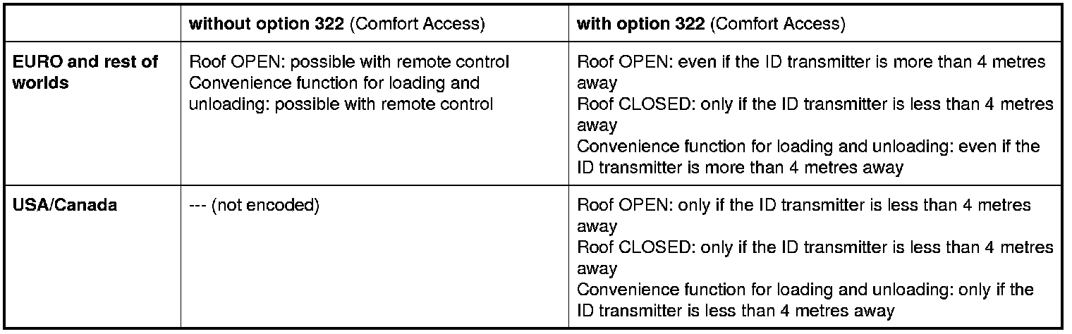 Conditions for operating Comfort Access (option 322) with the remote control or ID transmitter
