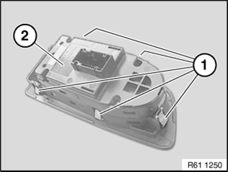 Retaining clips (1) of rocker switch for side window operation (2) must not be damaged or missing.