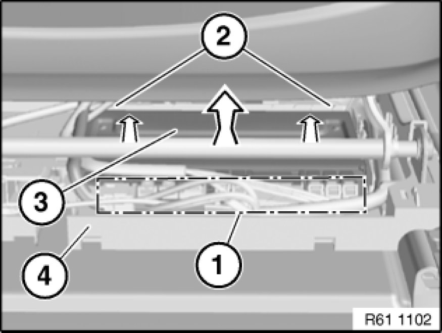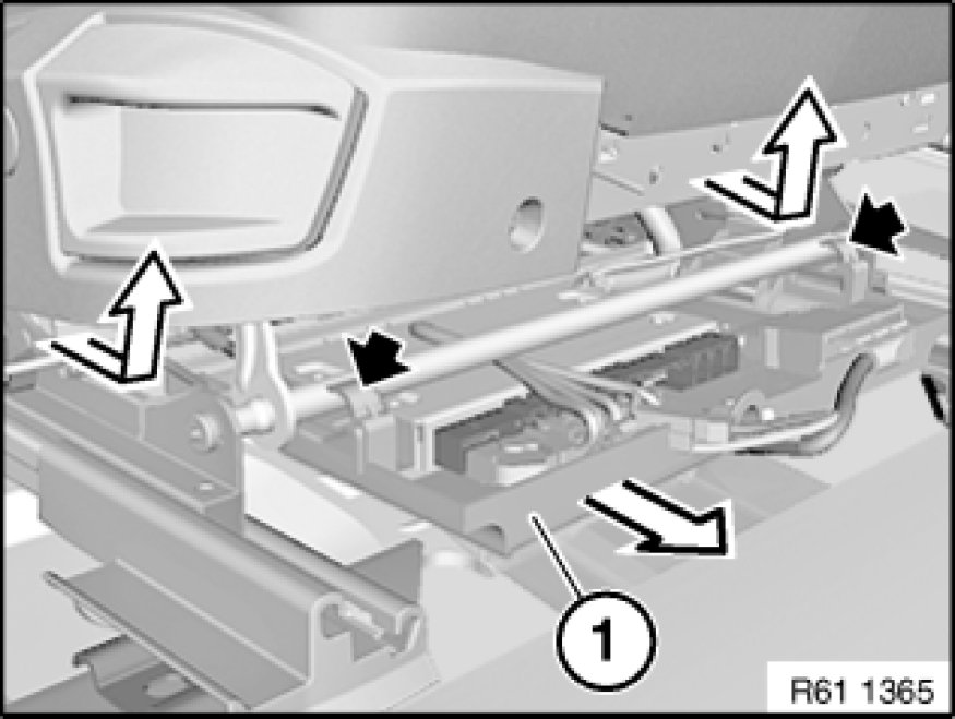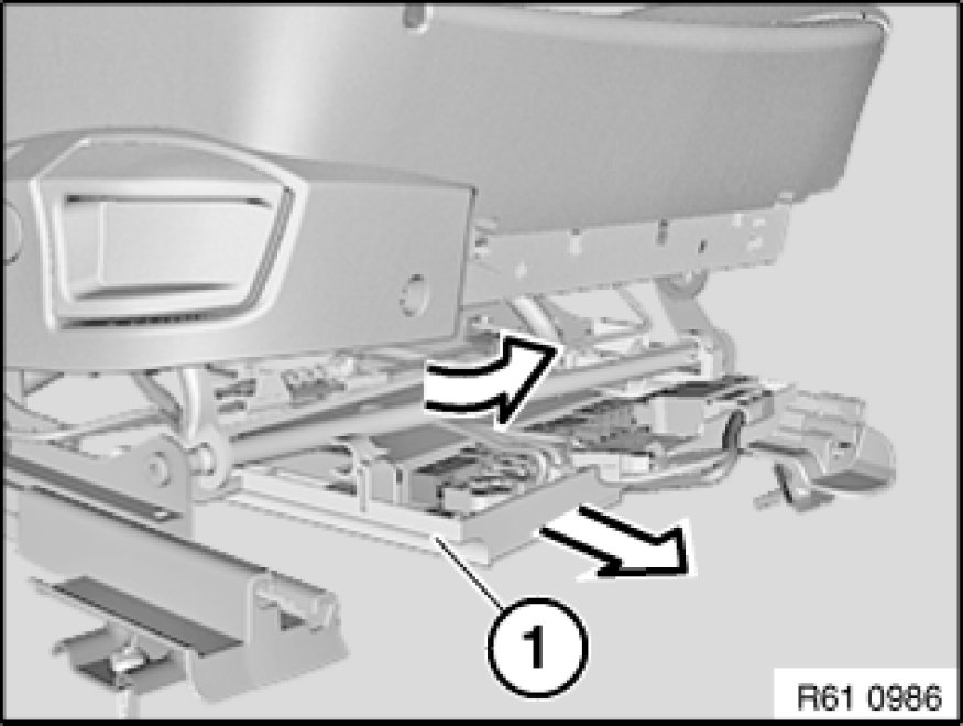 Unlock catches (2) towards rear, feed out control unit for seat adjustment (3) in direction of arrow and remove from seat rail (4).