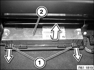 Unlock retaining tabs (1) towards front and remove control unit for seat adjustment (2) in direction of arrow.