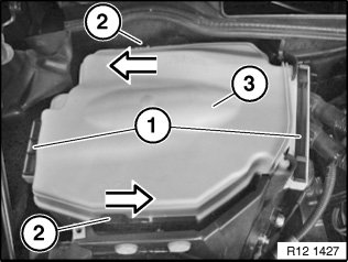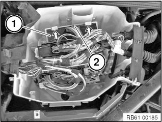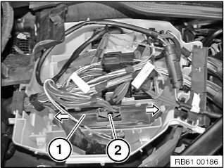 Release lugs in direction of arrow. Remove DC/DC converter (1) by pulling upward. Disconnect plug connection (2).