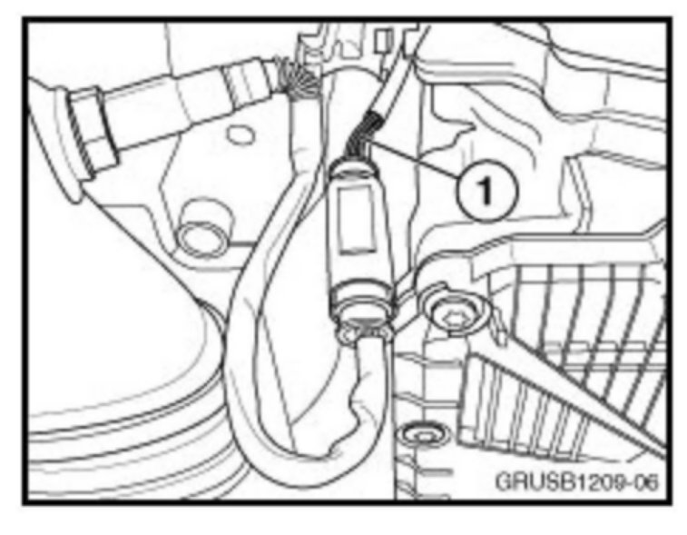 2. [NEW] Inspect the electrical harness for cylinder bank 1's post-catalytic converter oxygen sensor. The harness should be labeled with the letter "R" on a small white paper tag, wrapped around the corrugated harness protector (1).