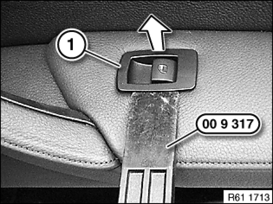 Lever rocker switch for side window operation (1) with special tool 00 9 317 in direction of arrow out of armrest.