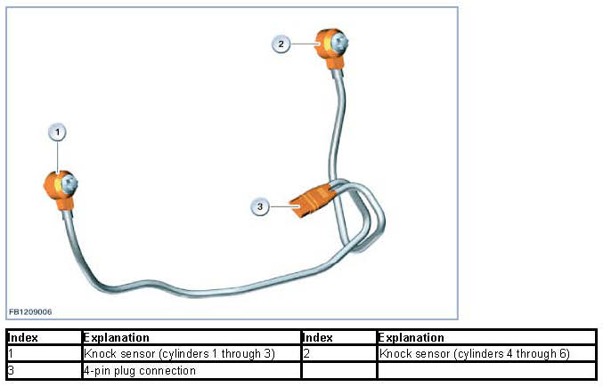 If multiple knock sensors are installed (e.g. with engine N55), the diagnostic function cannot detect and inadvertent mix-up of the two knock sensors. Installation of the knock sensors in the correct respective positions is of decisive importance for their correct operation. The length of the connecting cable and the distance to the cable connection identify the correct positions for the individual knock sensors. Ensure that the knock sensors are in the correct positions during installation.
