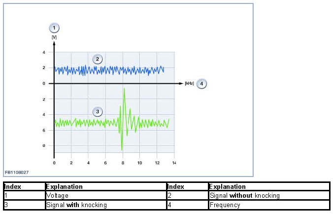 The knock sensor detects structure-borne noise within a frequency range extending from 5 to roughly 20 kHz. Engine knock generally occurs within an approximate frequency range of 7 to 16 kHz. The DME digital engine electronics system selects the ideal processing frequency for detecting combustion knock with reference to the following factors: