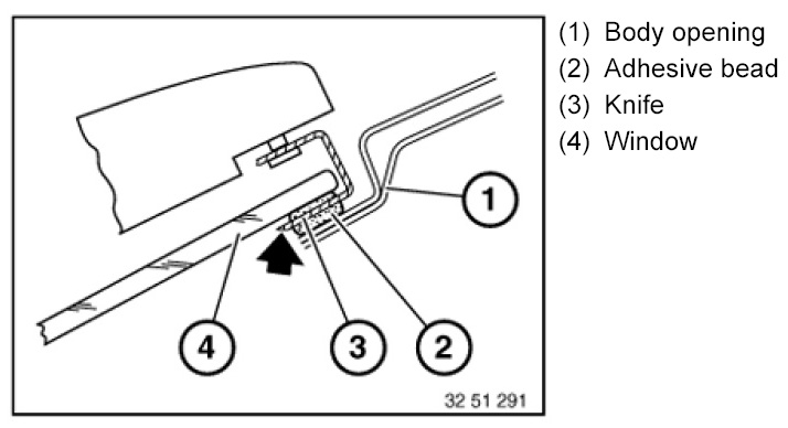 Cut through adhesive bead as closely as possible to window glass.