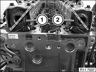With cylinder No. 1 in ignition TDC position, exhaust camshaft (2) at 6th cylinder points downwards at an angle to the right.