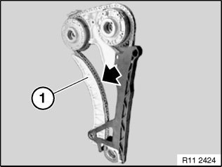Make sure that timing chain is guided in tensioning rail (1).