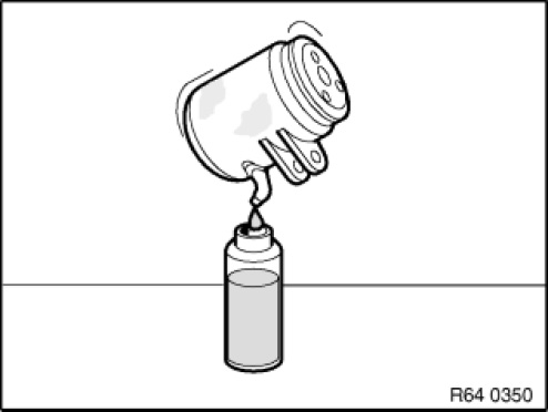 Transfer the refrigerant fluid remaining in the previous compressor via the oil filler plug completely into a measuring cup.
