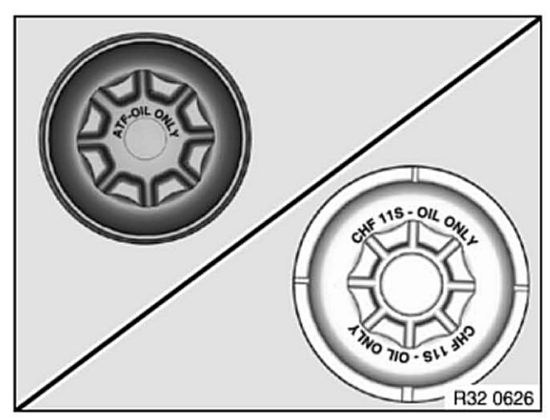 The hydraulic fluid resorvoirs are marked on the rim of the reservoir to show which type of Fluid can be used - ATF oil or Pentosin CHF oil.